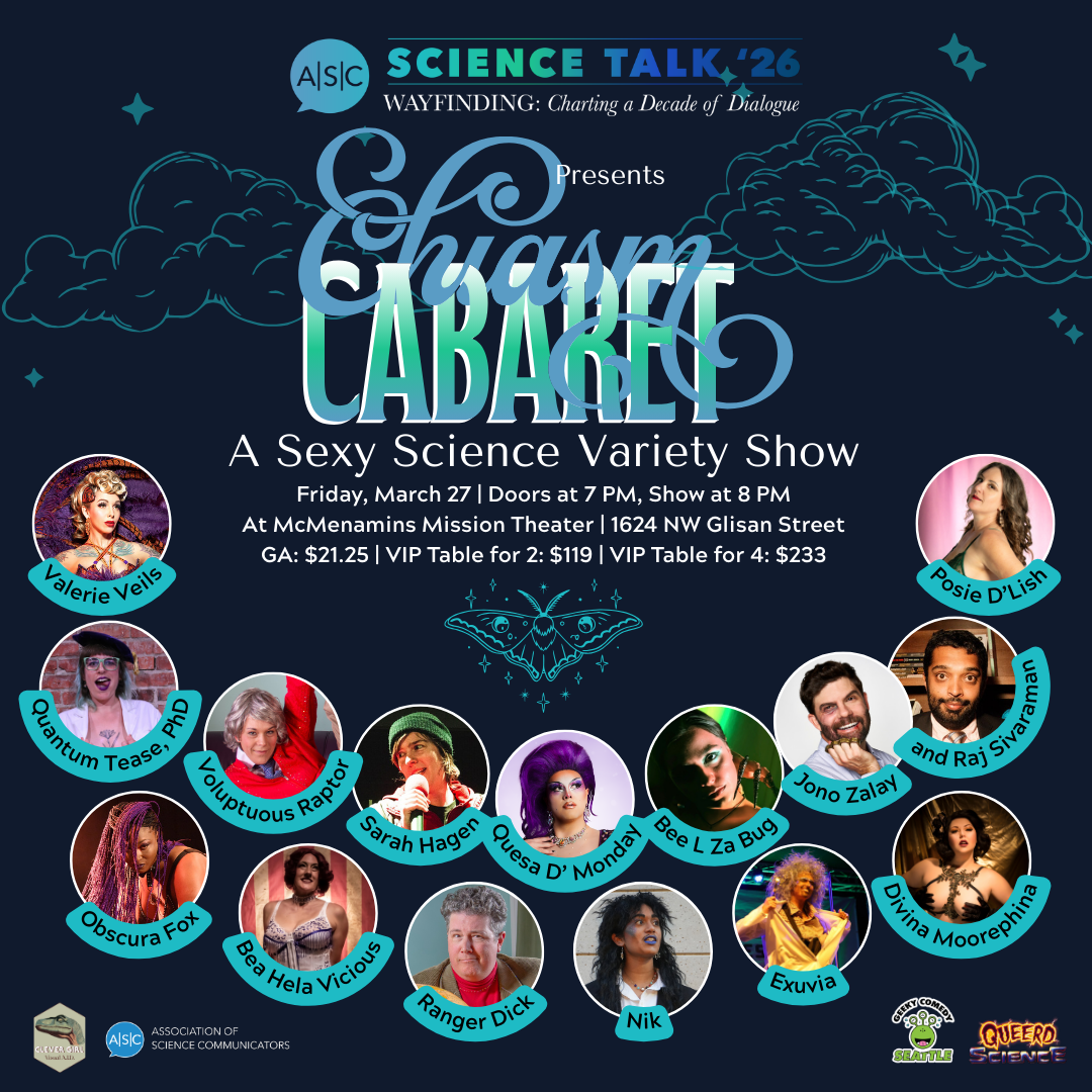 Chiasm Cabaret lights up McMenamins Mission Theater on March 27 with high-flying aerials, electrifying drag, and sizzling burlesque that all put science center stage in bold, unexpected ways. This upbeat, one-night-only showcase, presented in conjunction with the Association of Science Communication conference, turns cutting-edge ideas into glitter-soaked, jaw-dropping storytelling, making science feel like a party you absolutely do not want to miss.